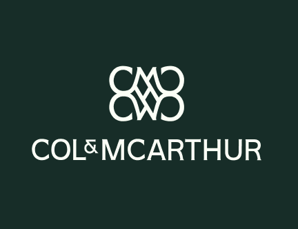 Le monogramme de Col&MacArthur signe la direction artistique. Il combine le C et le M ainsi qu’un H dissimulé au centre pour rappeler l’Histoire et l’Héritage. La typographie à empattements triangulaires fait écho aux gravures anciennes tout en conservant un style contemporain.